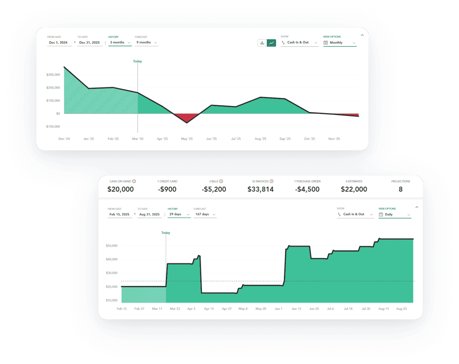 View your cash flow from multiple perspectives. Toggle between daily, weekly, monthly, or quarterly views to see both granular day-to-day details and the big picture up to 3 years out.