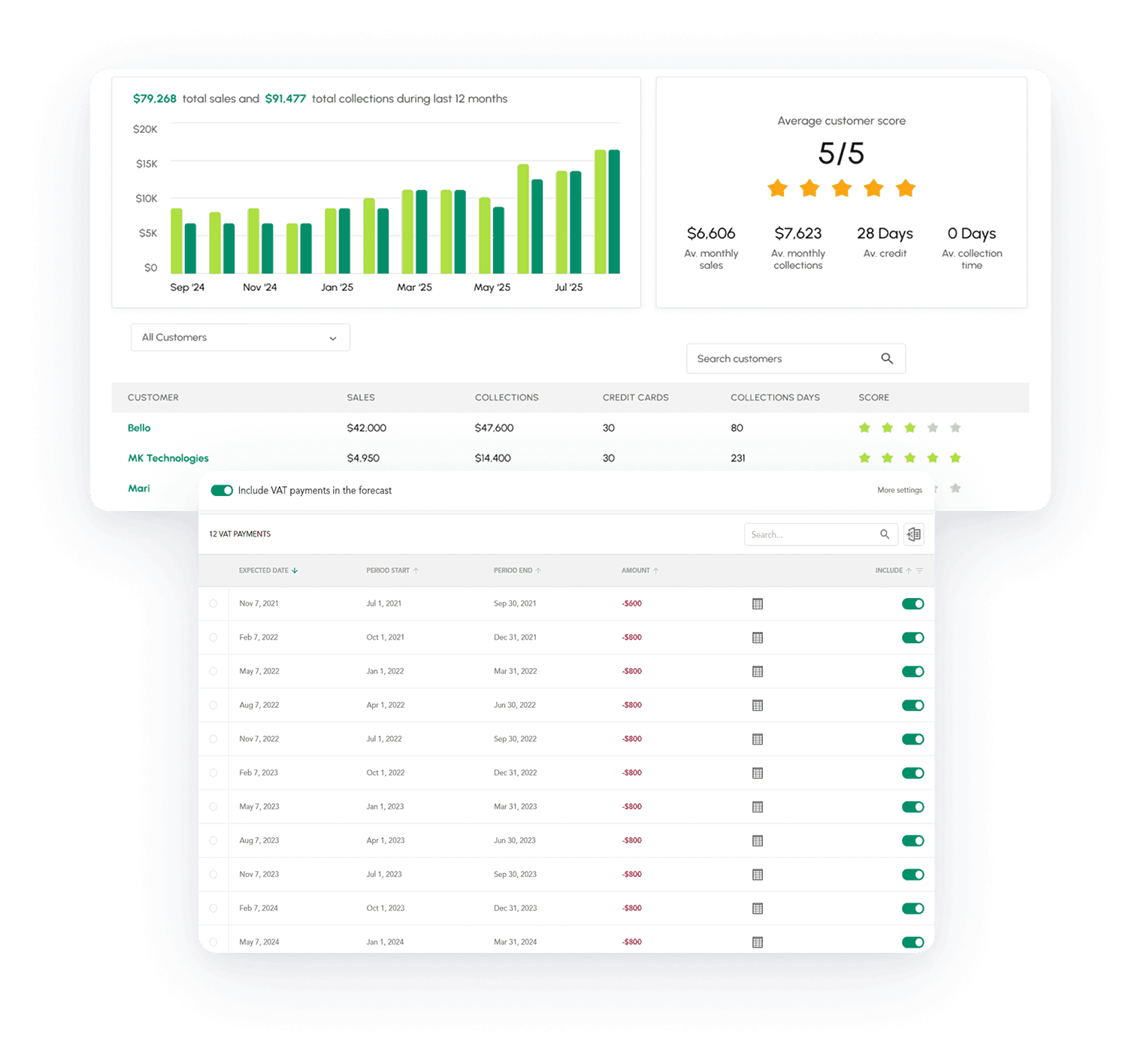 Customer insights rank your customers by sales, collections, and payment punctuality, helping you optimize payment terms and improve cash flow planning.